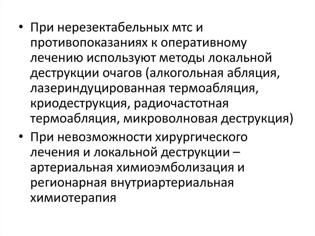 • При нерезектабельных мтс ипротивопоказаниях к оперативному