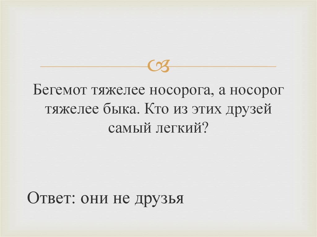Бегемот тяжелее носорога, а носорогтяжелее быка. Кто из этих друзей