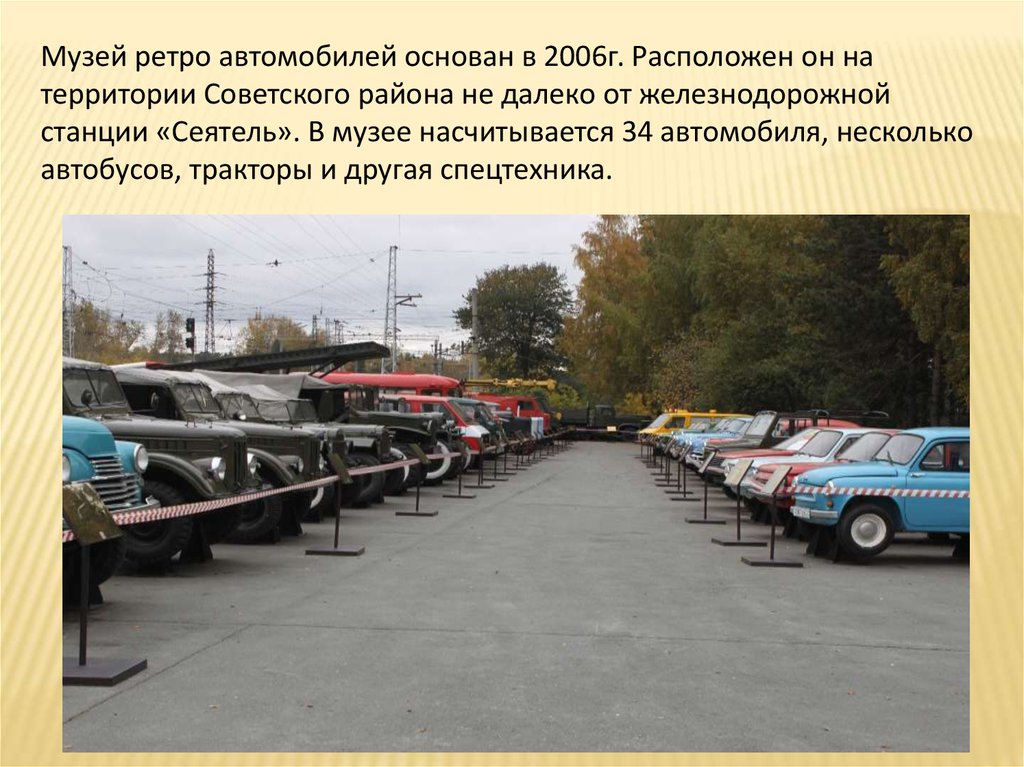 Музей ретро автомобилей основан в 2006г. Расположен он натерритории Советского района не далеко от железнодорожной