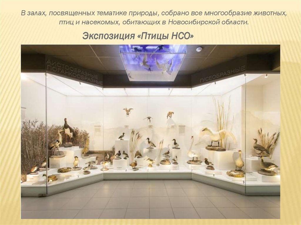 В залах, посвященных тематике природы, собрано все многообразие животных,птиц и насекомых, обитающих в Новосибирской области.