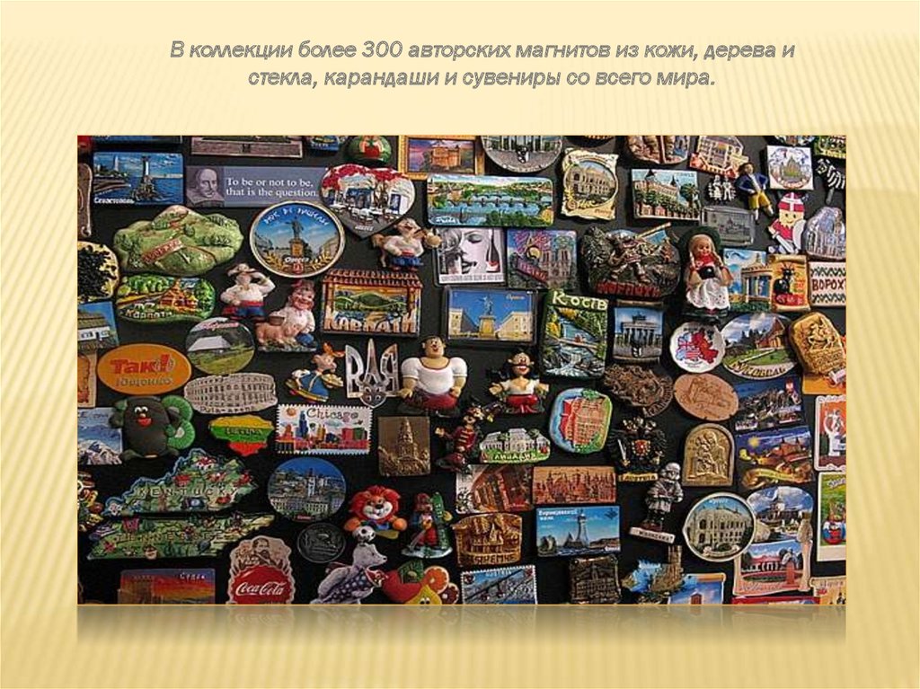 В коллекции более 300 авторских магнитов из кожи, дерева истекла, карандаши и сувениры со всего мира.
