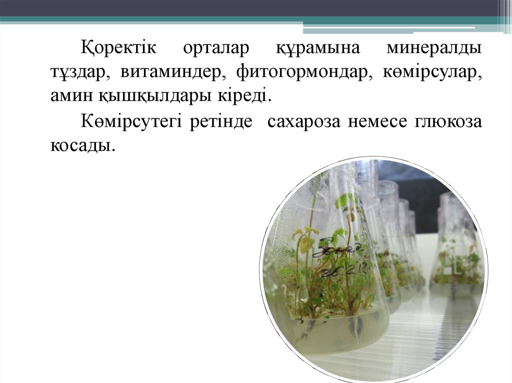 Қоректік орталар құрамына минералдытұздар, витаминдер, фитогормондар, көмірсулар,
