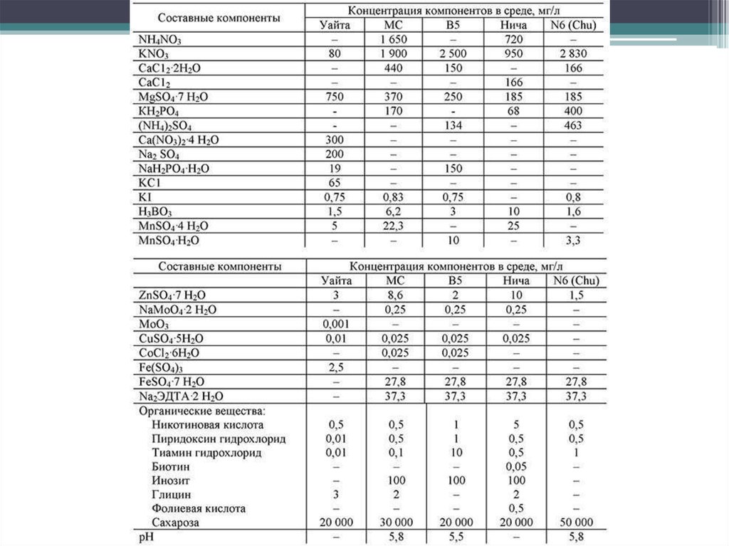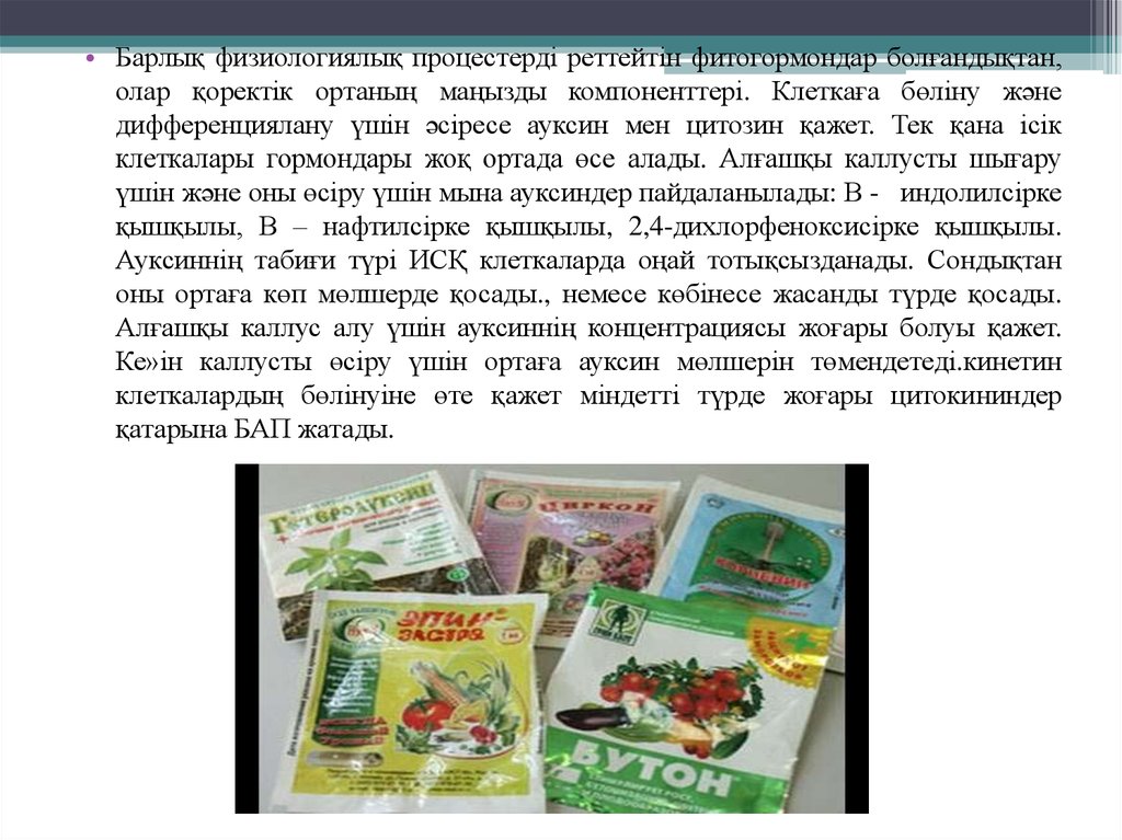 • Барлық физиологиялық процестерді реттейтін фитогормондар болғандықтан,олар қоректік ортаның маңызды компоненттері. Клеткаға бөліну және