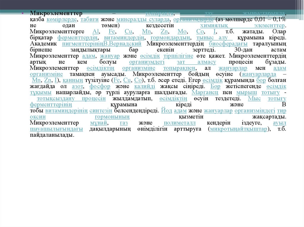Микроэлементтерге Al, Fe, Cu, Mn, Zn, Mo, Co, І, т.б. жатады. Олар