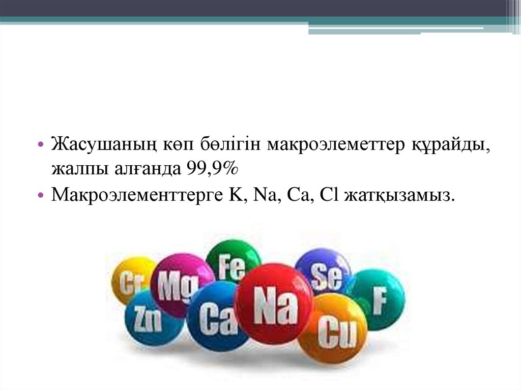 • Жасушаның көп бөлігін макроэлеметтер құрайды,жалпы алғанда 99,9%