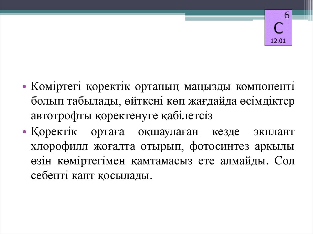 • Көміртегі қоректік ортаның маңызды компонентіболып табылады, өйткені көп жағдайда өсімдіктер