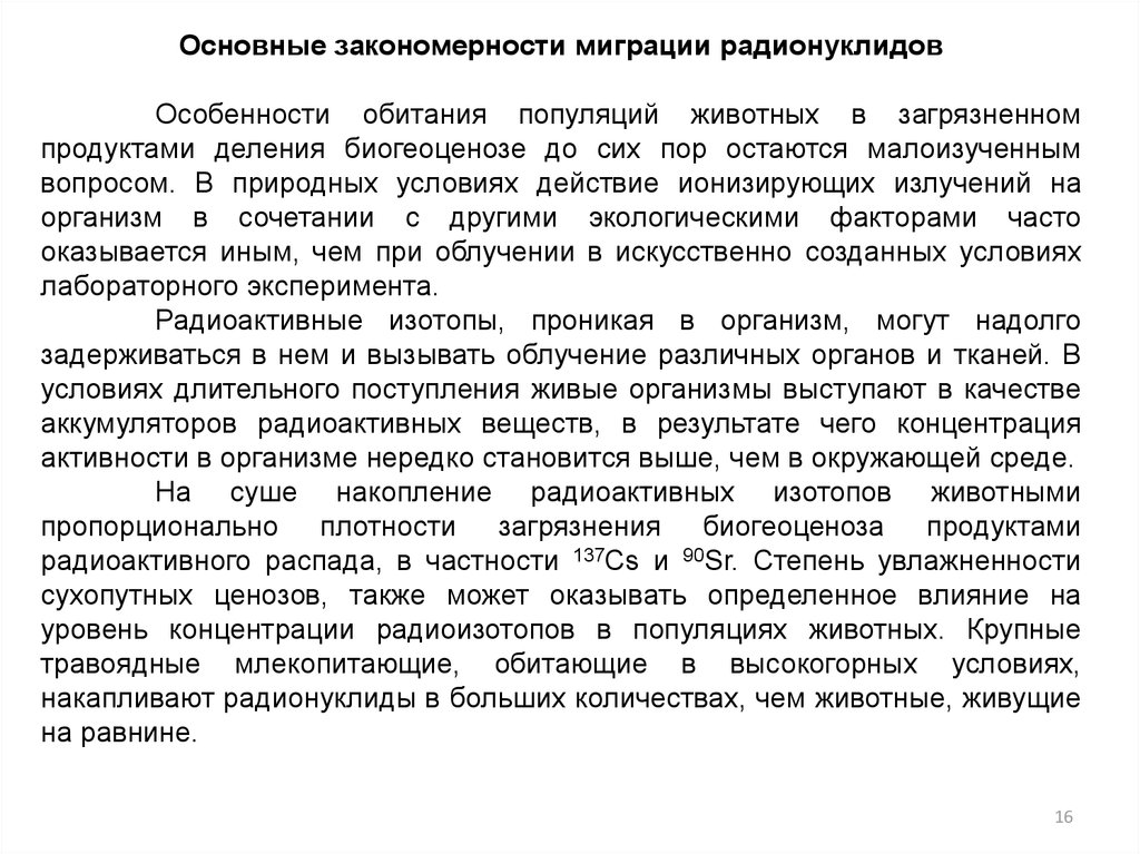 Основные закономерности миграции радионуклидовОсобенности обитания популяций животных в загрязненном