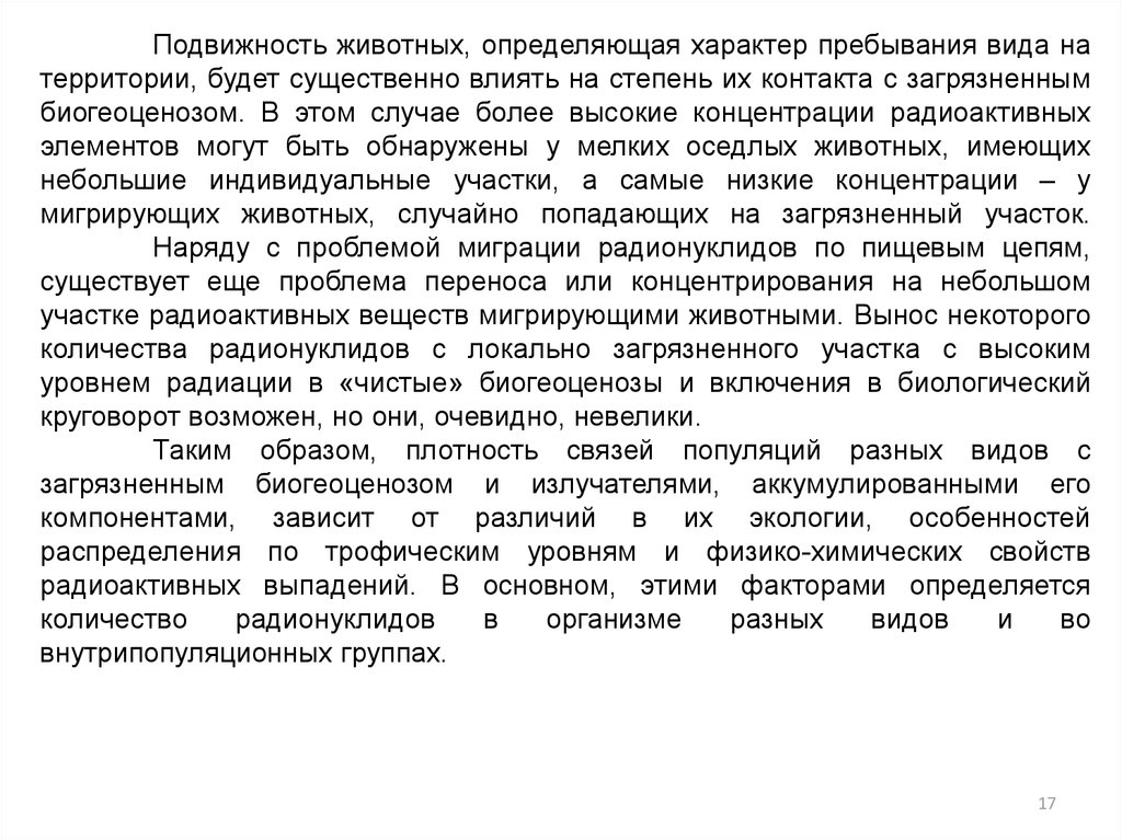 Подвижность животных, определяющая характер пребывания вида натерритории, будет существенно влиять на степень их контакта с загрязненным