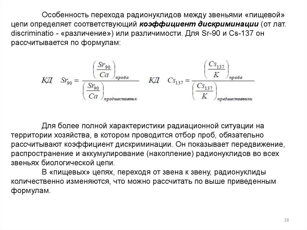 Особенность перехода радионуклидов между звеньями «пищевой»цепи определяет соответствующий коэффициент дискриминации (от лат.