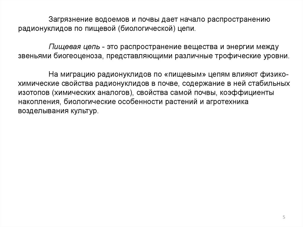 Загрязнение водоемов и почвы дает начало распространениюрадионуклидов по пищевой (биологической) цепи.