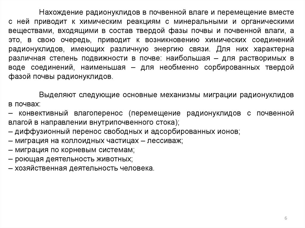 Нахождение радионуклидов в почвенной влаге и перемещение вместес ней приводит к химическим реакциям с минеральными и органическими