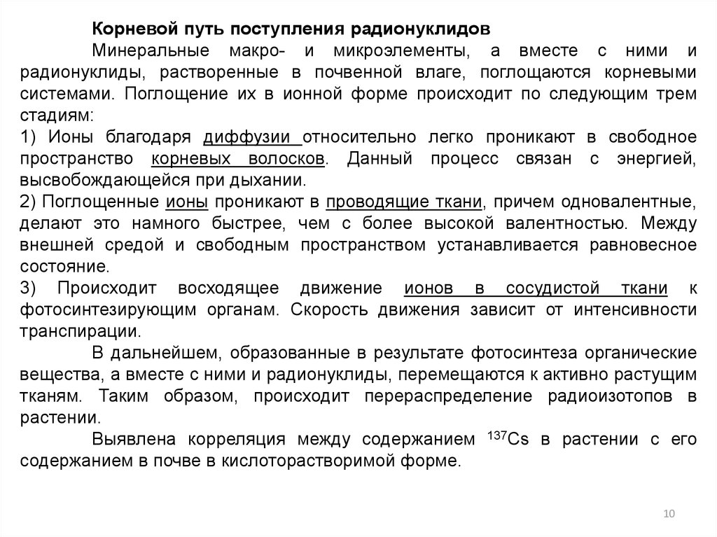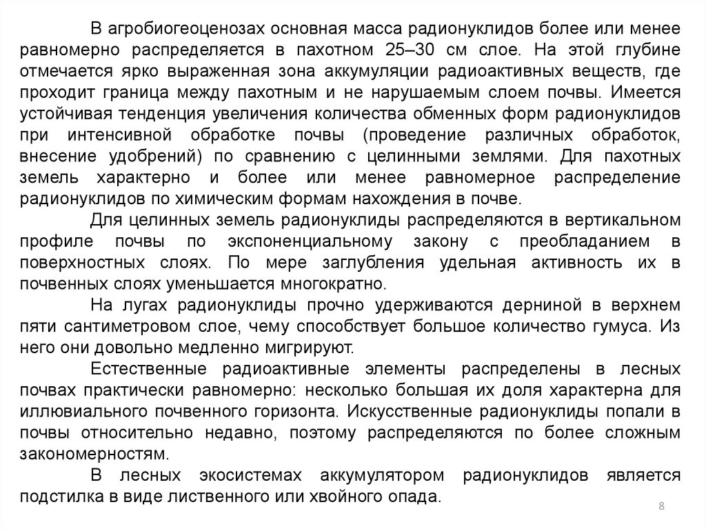 На миграцию радионуклидов по «пищевым» цепям влияют физикохимические свойства радионуклидов в почве, содержание в ней стабильных
