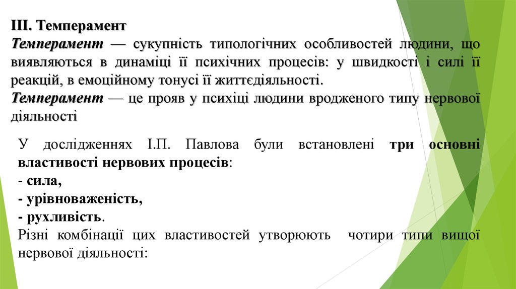 III. ТемпераментТемперамент — сукупність типологічних особливостей людини, що