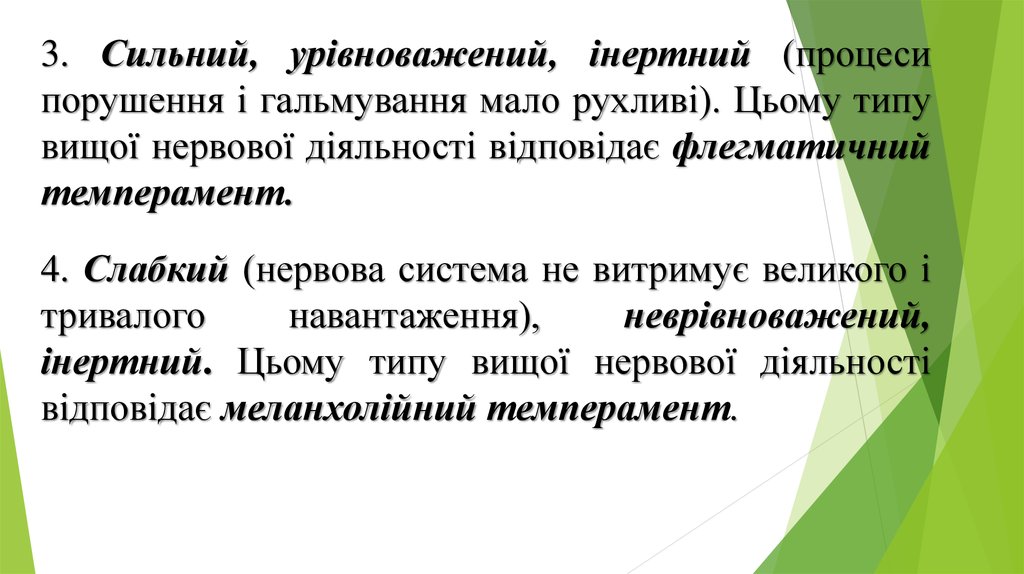 3. Сильний, урівноважений, інертний (процесипорушення і гальмування мало рухливі). Цьому типу
