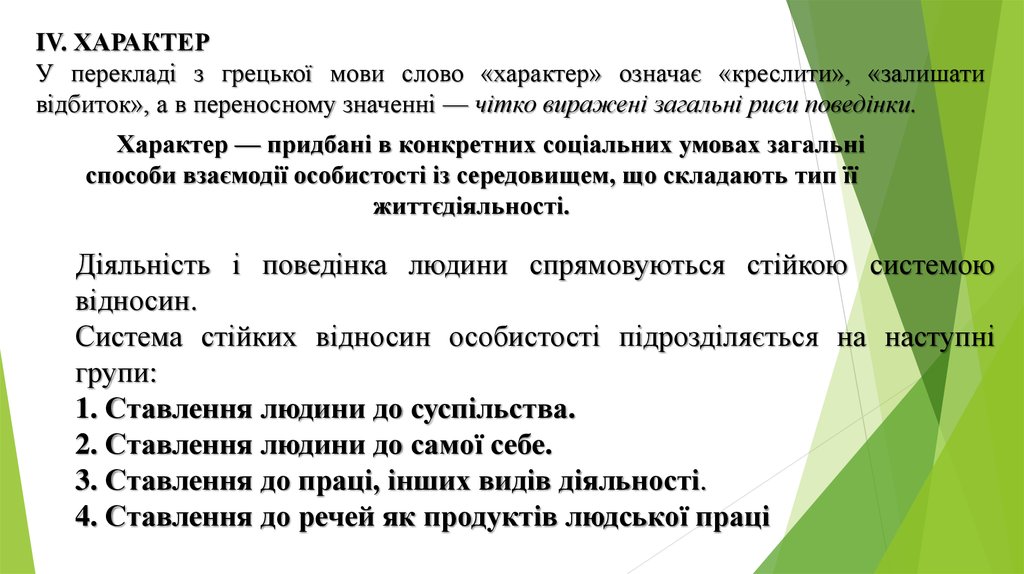IV. ХАРАКТЕРУ перекладі з грецької мови слово «характер» означає «креслити», «залишати