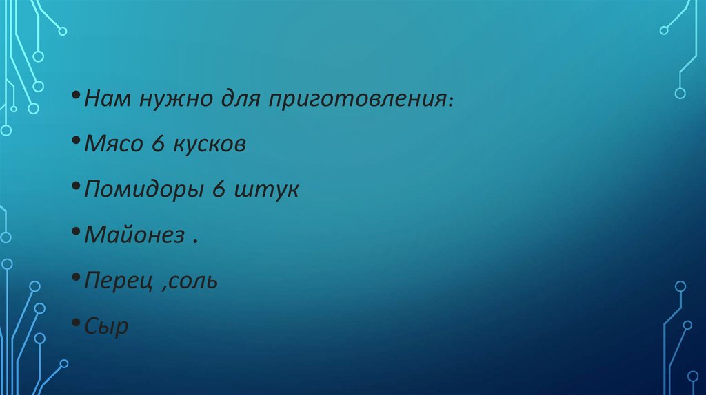 • Нам нужно для приготовления:• Мясо 6 кусков