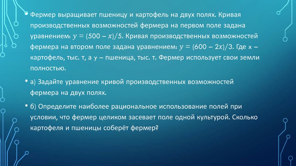 • Фермер выращивает пшеницу и картофель на двух полях. Криваяпроизводственных возможностей фермера на первом поле задана