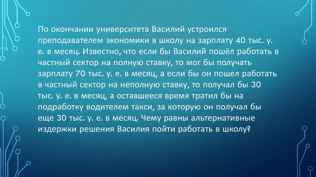 По окончании университета Василий устроилсяпреподавателем экономики в школу на зарплату 40 тыс. у.