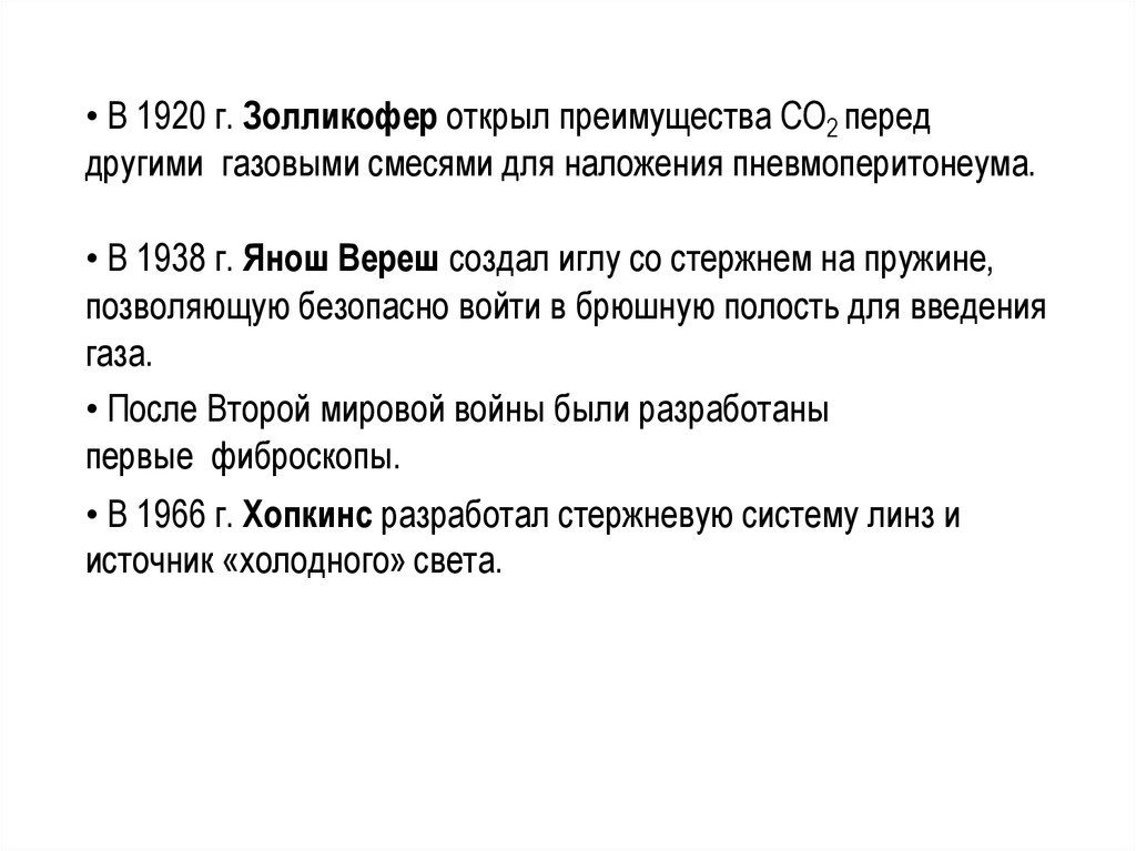 • В 1920 г. Золликофер открыл преимущества CO2 переддругими газовыми смесями для наложения пневмоперитонеума.