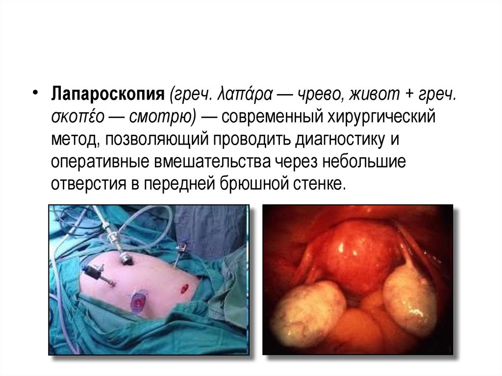 • Лапароскопия (греч. λαπάρα — чрево, живот + греч.σκοπέο — смотрю) — современный хирургический