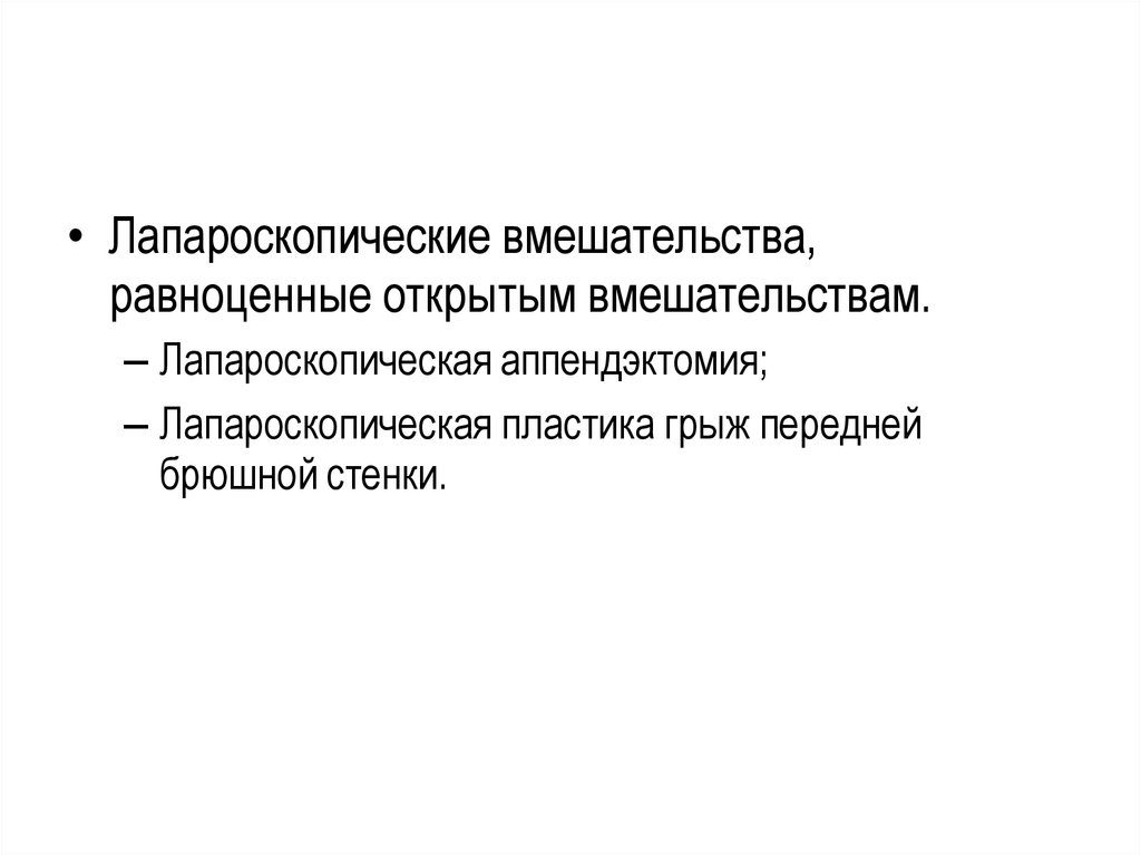 • Лапароскопические вмешательства,равноценные открытым вмешательствам.