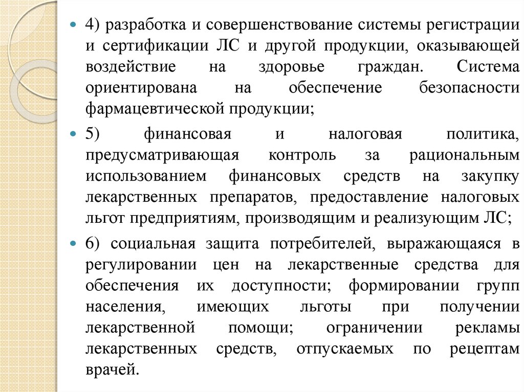 4) разработка и совершенствование системы регистрациии сертификации ЛС и другой продукции, оказывающей