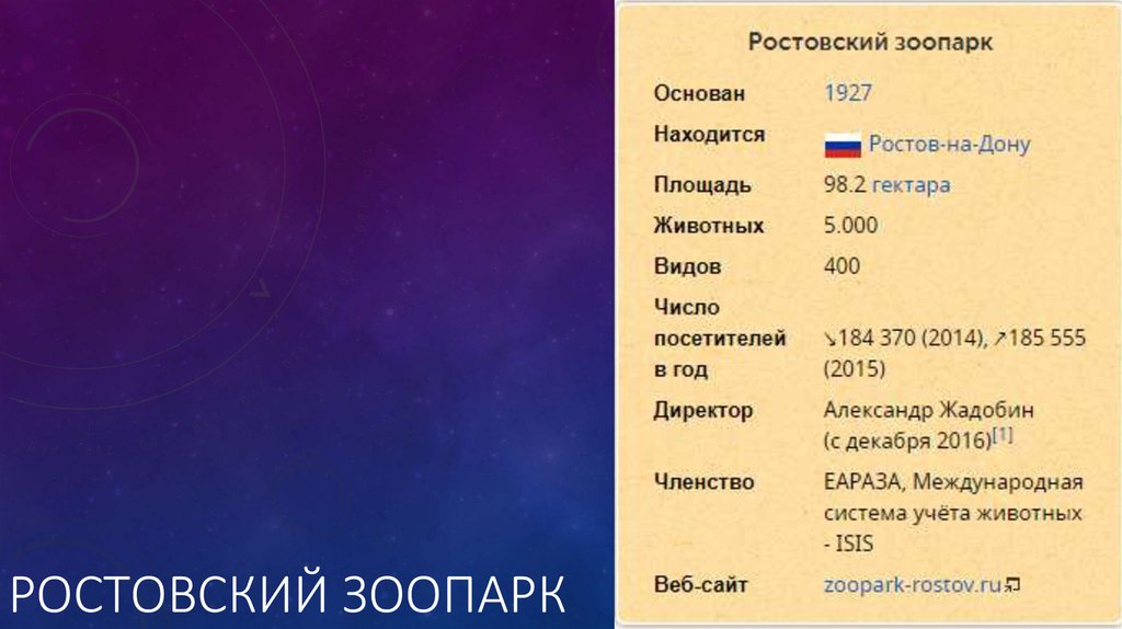 ОДИН ИЗ КРУПНЕЙШИХ ЗООПАРКОВ РОССИИ (ПЛОЩАДЬЮ ПОЧТИ 90 ГЕКТАРОВ), БОГАТЫЙ СВОИМИТРАДИЦИЯМИ ЗООЛОГИЧЕСКИЙ ПАРК. РАСПОЛОЖЕН В РОСТОВЕ-НА-ДОНУ.