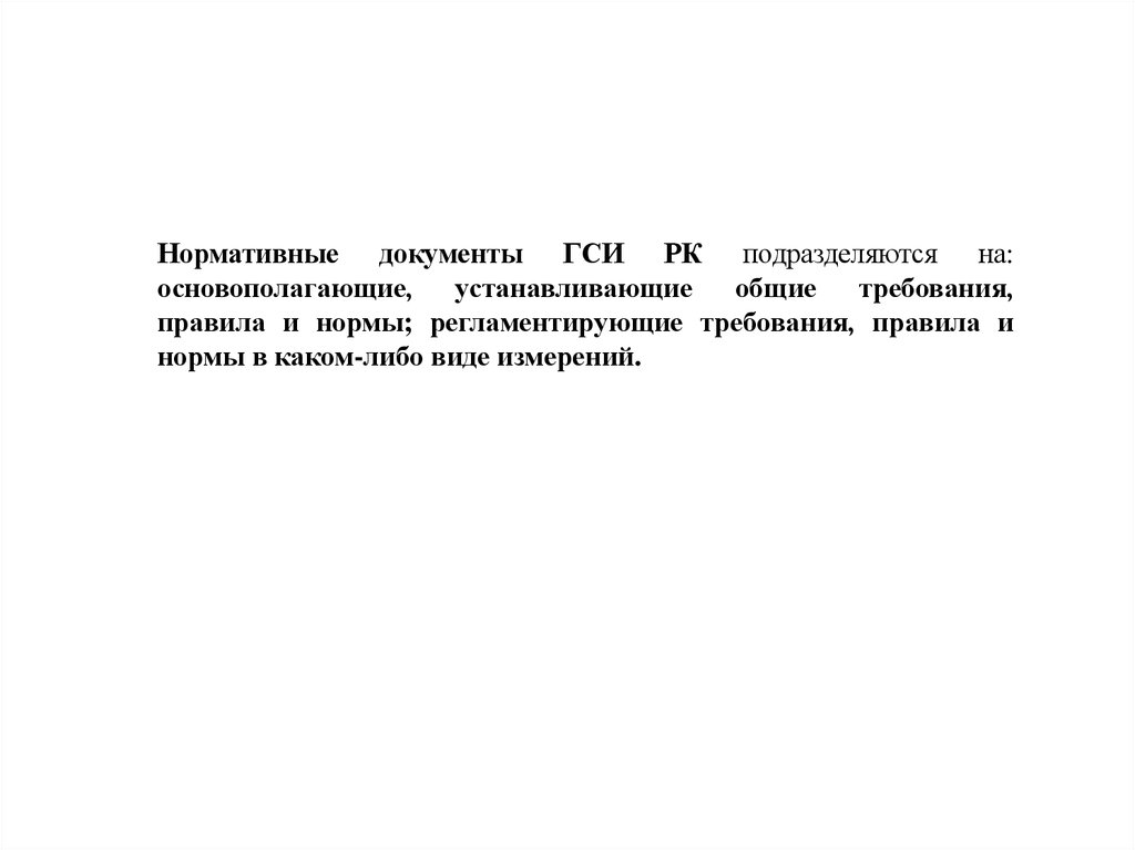Нормативные документы ГСИ РК подразделяются на:основополагающие, устанавливающие общие требования,