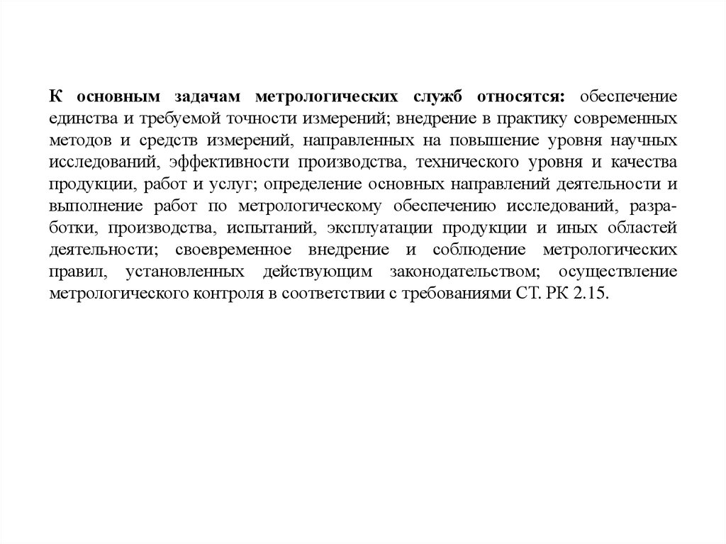 К основным задачам метрологических служб относятся: обеспечениеединства и требуемой точности измерений; внедрение в практику современных