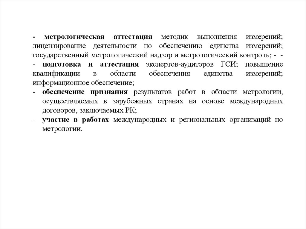 - метрологическая аттестация методик выполнения измерений;лицензирование деятельности по обеспечению единства измерений;