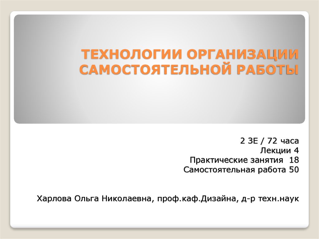1. ТЕХНОЛОГИИ ОРГАНИЗАЦИИ САМОСТОЯТЕЛЬНОЙ РАБОТЫ 2 ЗЕ / 72 часа Лекции 4 Практические занятия 18 Самостоятельная работа 50 Харлова
