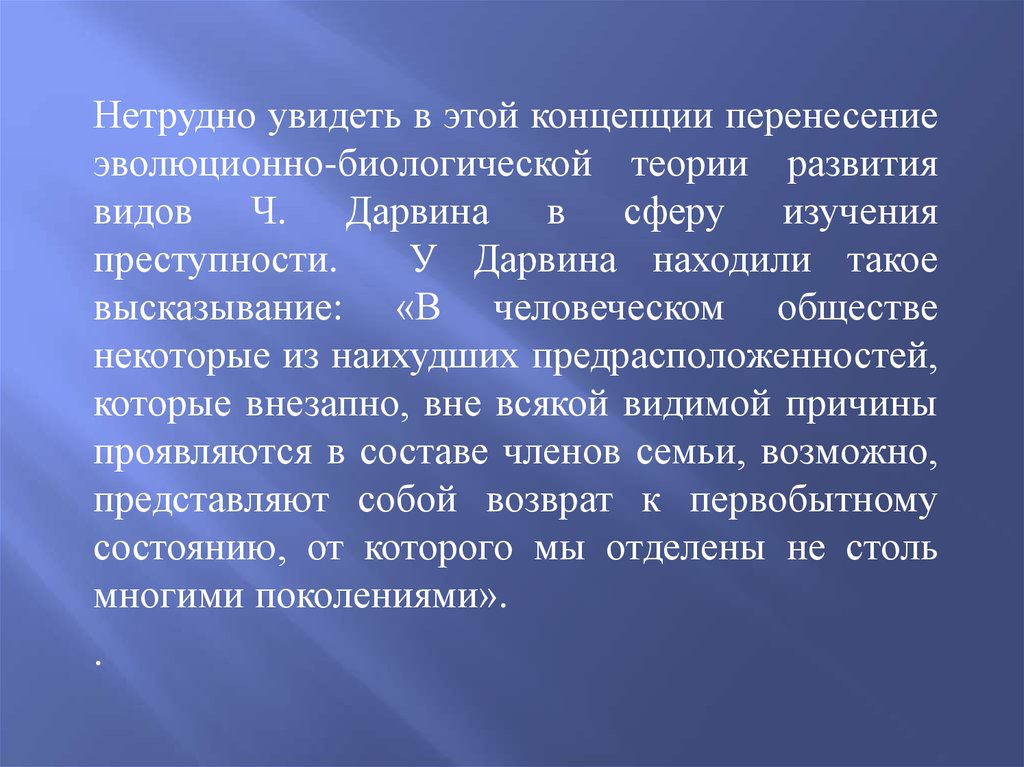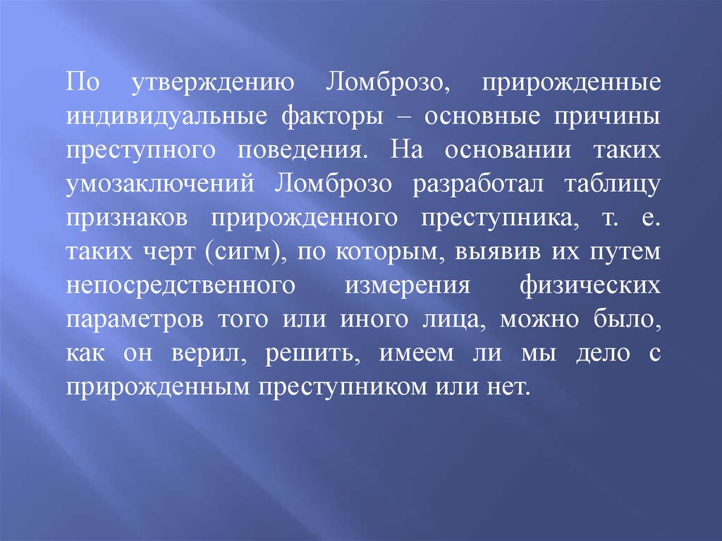По утверждению Ломброзо, прирожденныеиндивидуальные факторы – основные причины