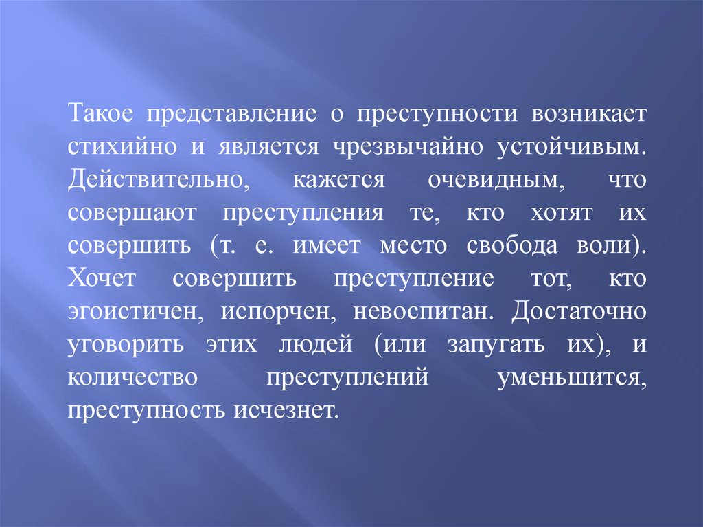 Такое представление о преступности возникаетстихийно и является чрезвычайно устойчивым.