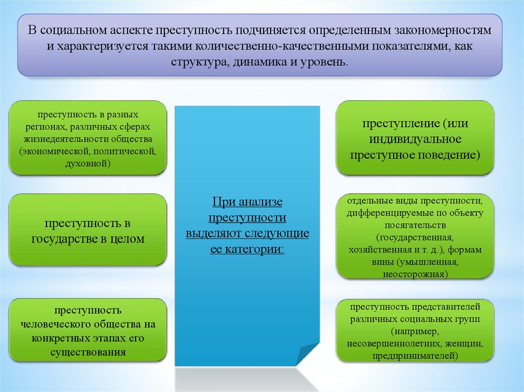 В социальном аспекте преступность подчиняется определенным закономерностями характеризуется такими количественно-качественными показателями, как