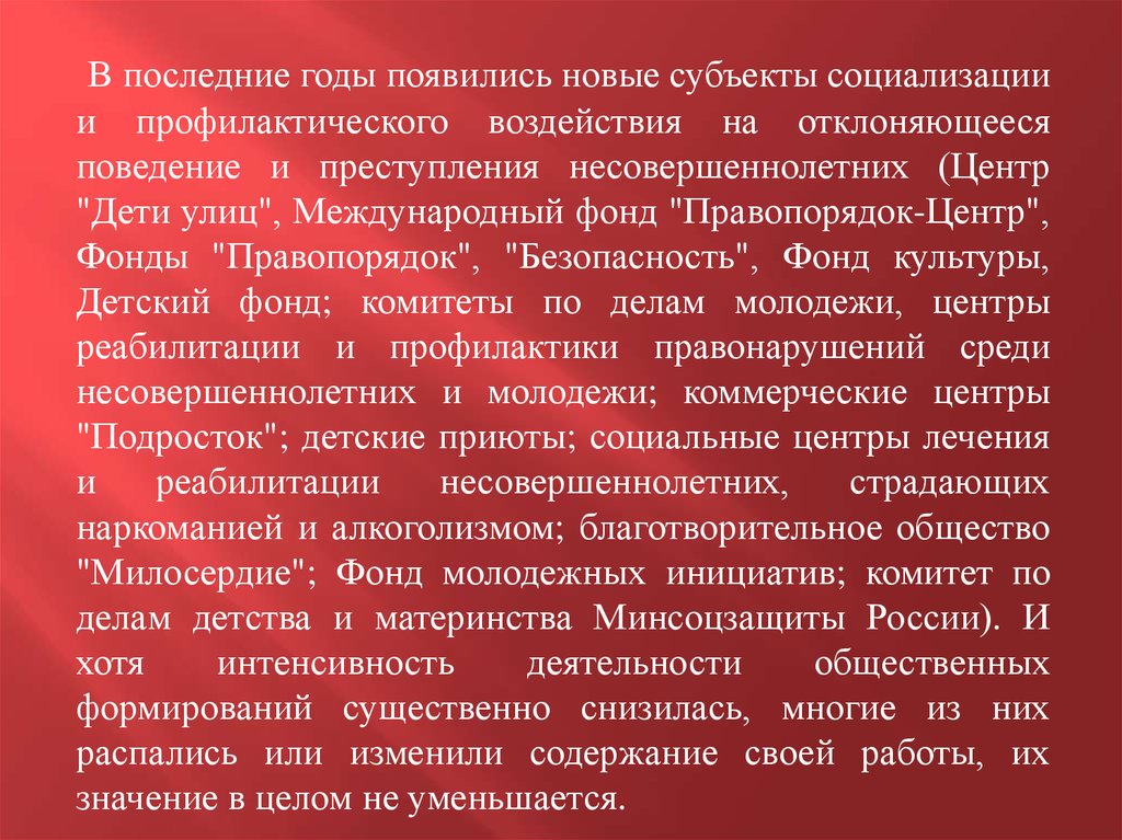 В последние годы появились новые субъекты социализациии профилактического воздействия на отклоняющееся
