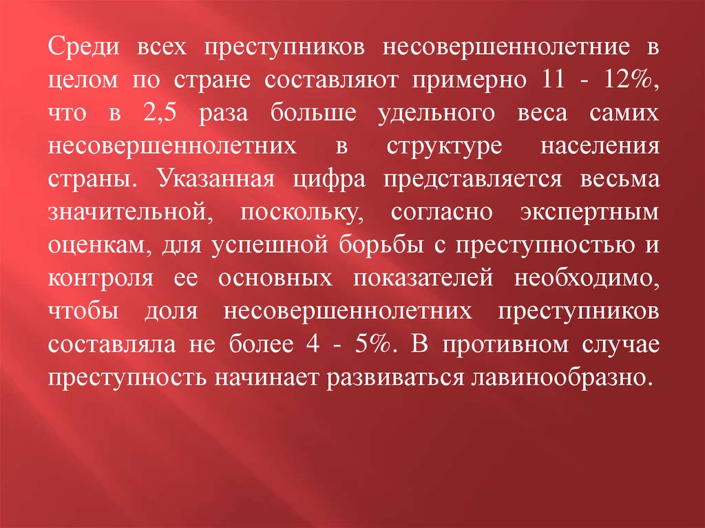 Среди всех преступников несовершеннолетние вцелом по стране составляют примерно 11 - 12%,