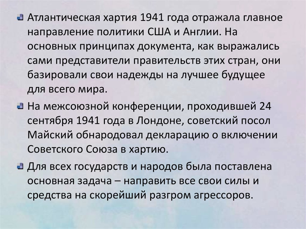 Атлантическая хартия 1941 года отражала главноенаправление политики США и Англии. На