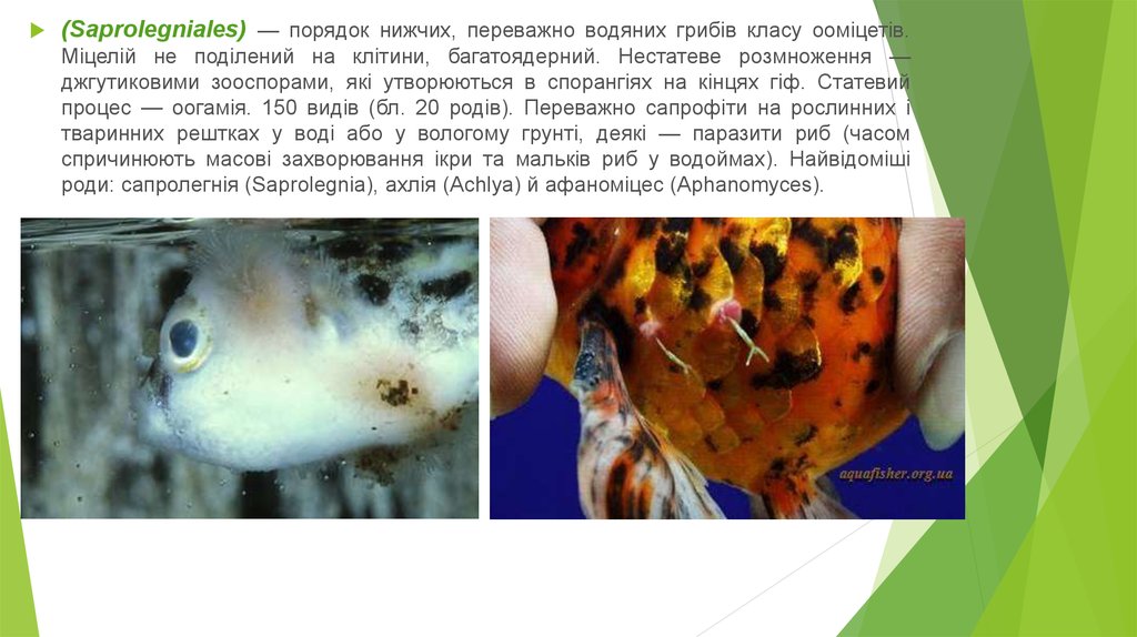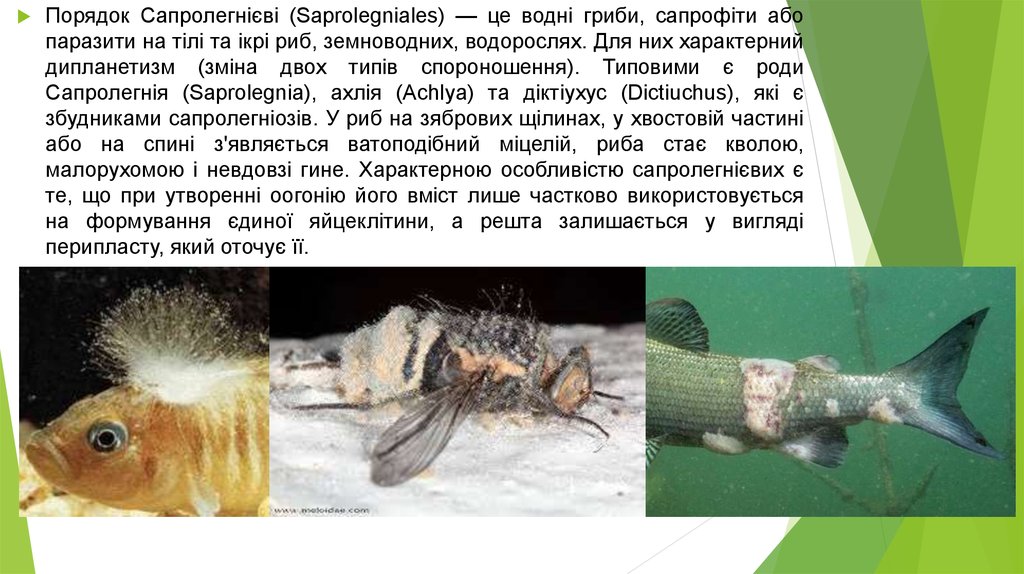 Сапролегнія (Saprolegnia), ахлія (Achlya) та діктіухус (Dictiuchus), які є