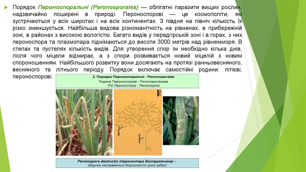 Порядок Пероноспоральні (Peronosporales) — облігатні паразити вищих рослин,надзвичайно поширені в природі. Пероноспорові — це космополіти, які
