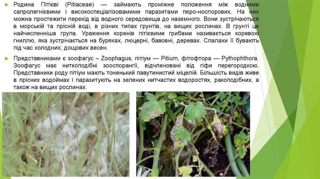 Родина Пітієві (Pitiaceae) — займають проміжне положення між воднимисапролегнієвими і високоспеціалізовамими паразитами перо-носпорових. На них