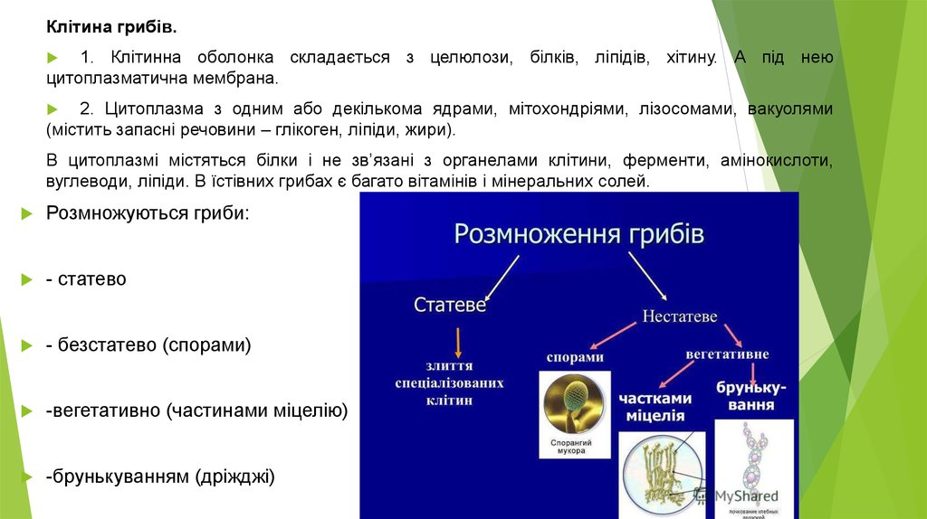 Клітина грибів.1. Клітинна оболонка складається з целюлози, білків, ліпідів, хітину. А під нею