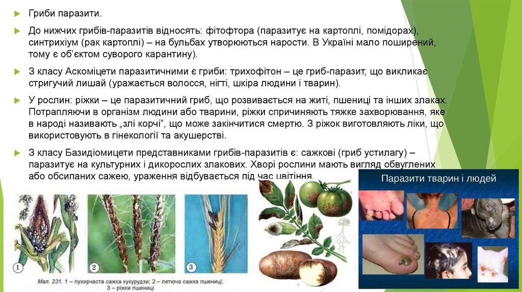 Гриби паразити.До нижчих грибів-паразитів відносять: фітофтора (паразитує на картоплі, помідорах),