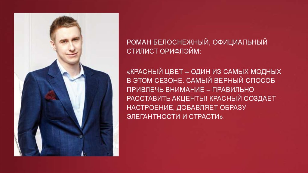 РОМАН БЕЛОСНЕЖНЫЙ, ОФИЦИАЛЬНЫЙСТИЛИСТ ОРИФЛЭЙМ: