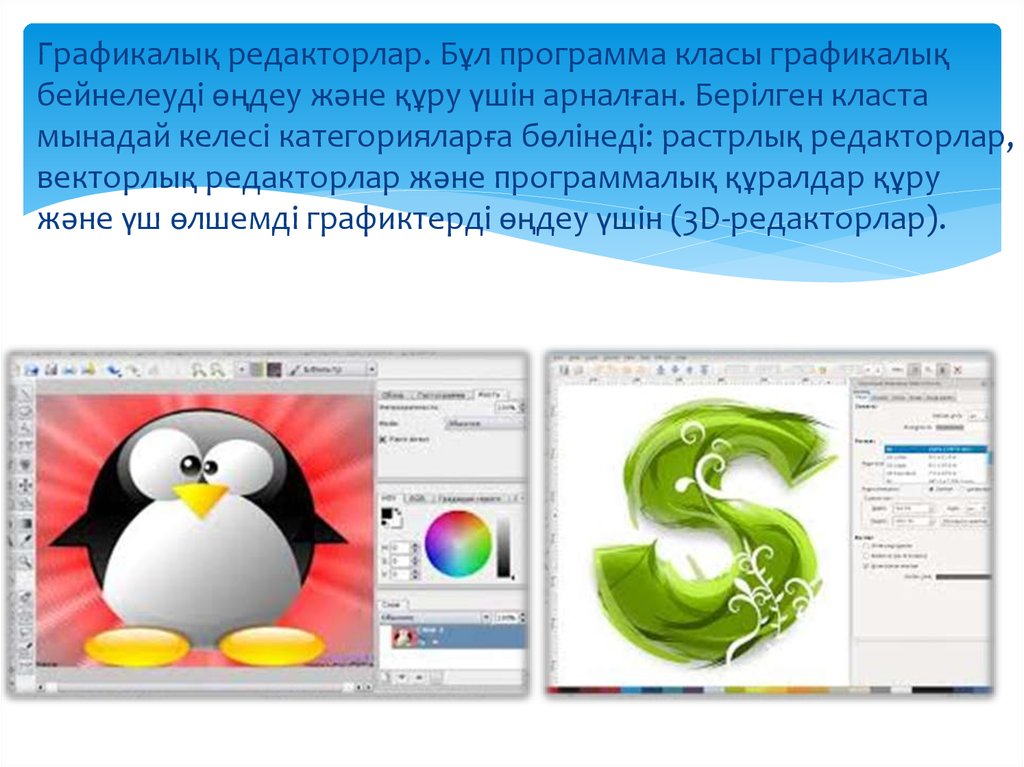 Графикалық редакторлар. Бұл программа класы графикалықбейнелеуді өңдеу және құру үшін арналған. Берілген класта
