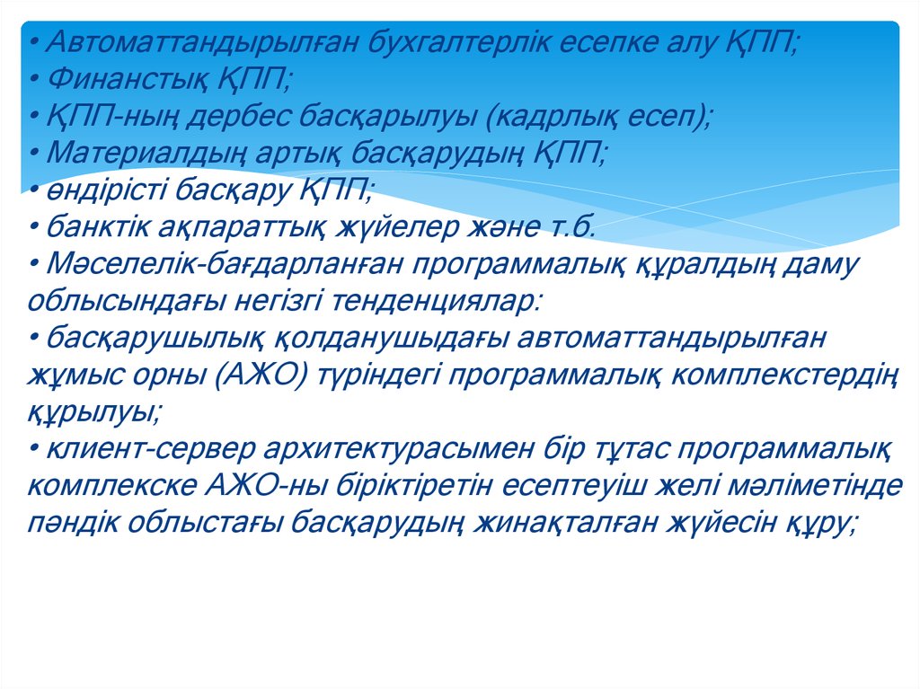 • Автоматтандырылған бухгалтерлік есепке алу ҚПП;• Финанстық ҚПП;