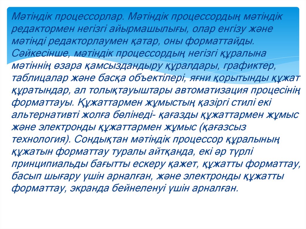 Мәтіндік процессорлар. Мәтіндік процессордың мәтіндікредактормен негізгі айырмашылығы, олар енгізу және