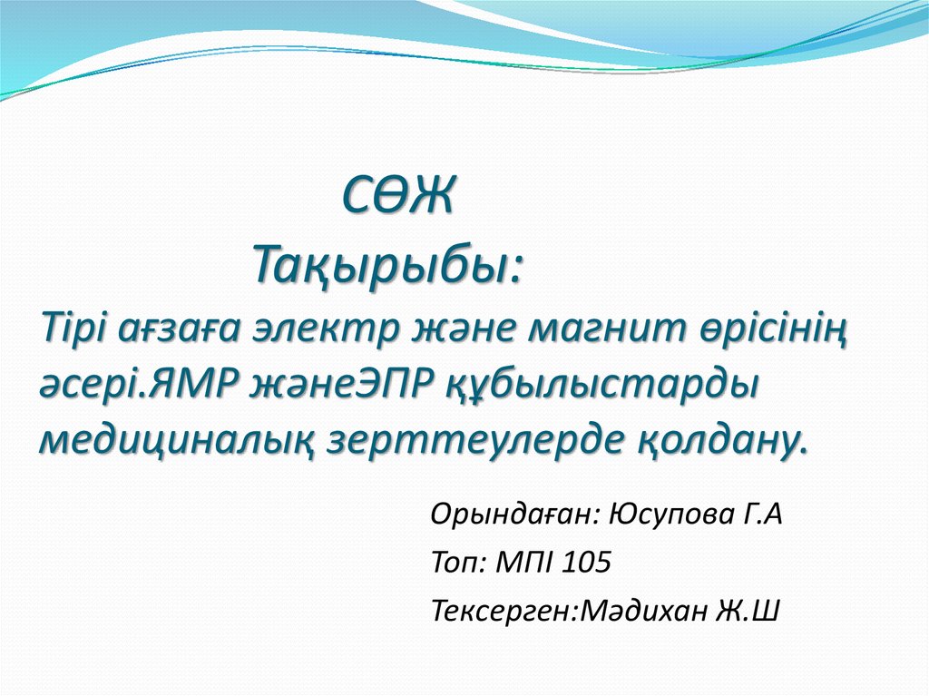 1. СӨЖ Тақырыбы: Тірі ағзаға электр және магнит өрісінің әсері.ЯМР жәнеЭПР құбылыстарды медициналық зерттеулерде қолдану.