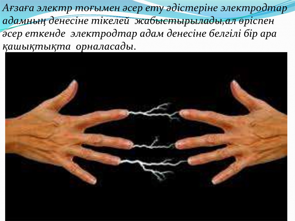 Ағзаға электр тоғымен әсер ету әдістеріне электродтарадамның денесіне тікелей жабыстырылады,ал өріспен