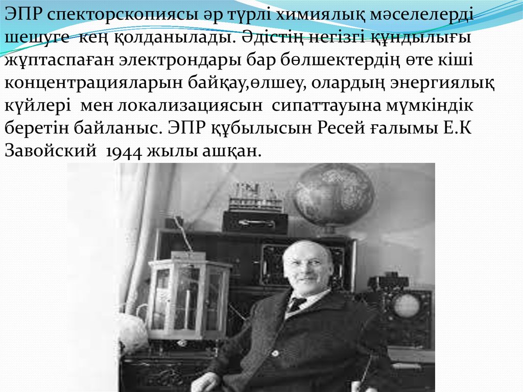 ЭПР спекторскопиясы әр түрлі химиялық мәселелердішешуге кең қолданылады. Әдістің негізгі құндылығы