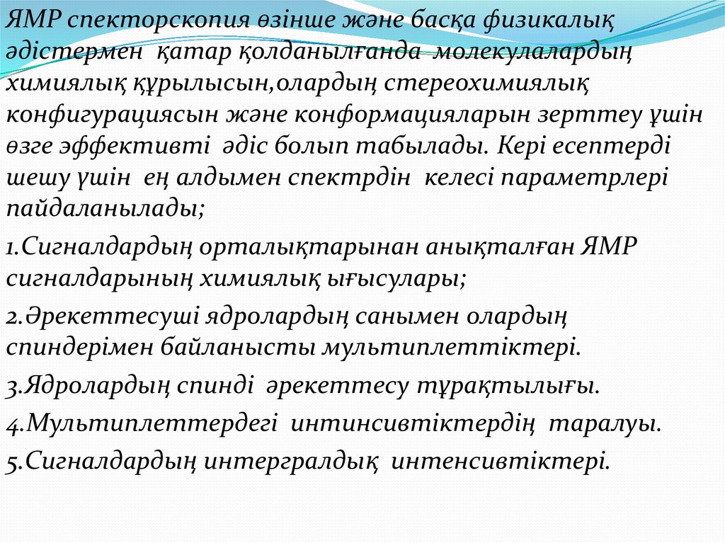 ЯМР спекторскопия өзінше және басқа физикалықәдістермен қатар қолданылғанда молекулалардың